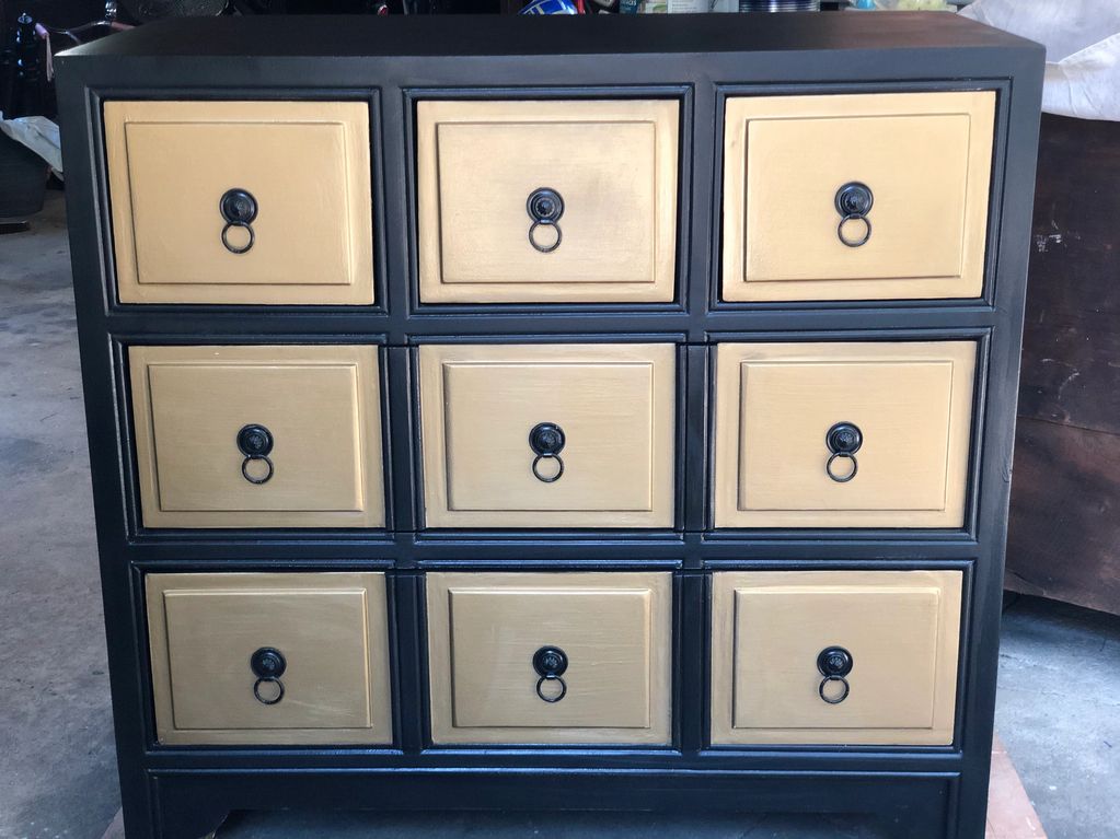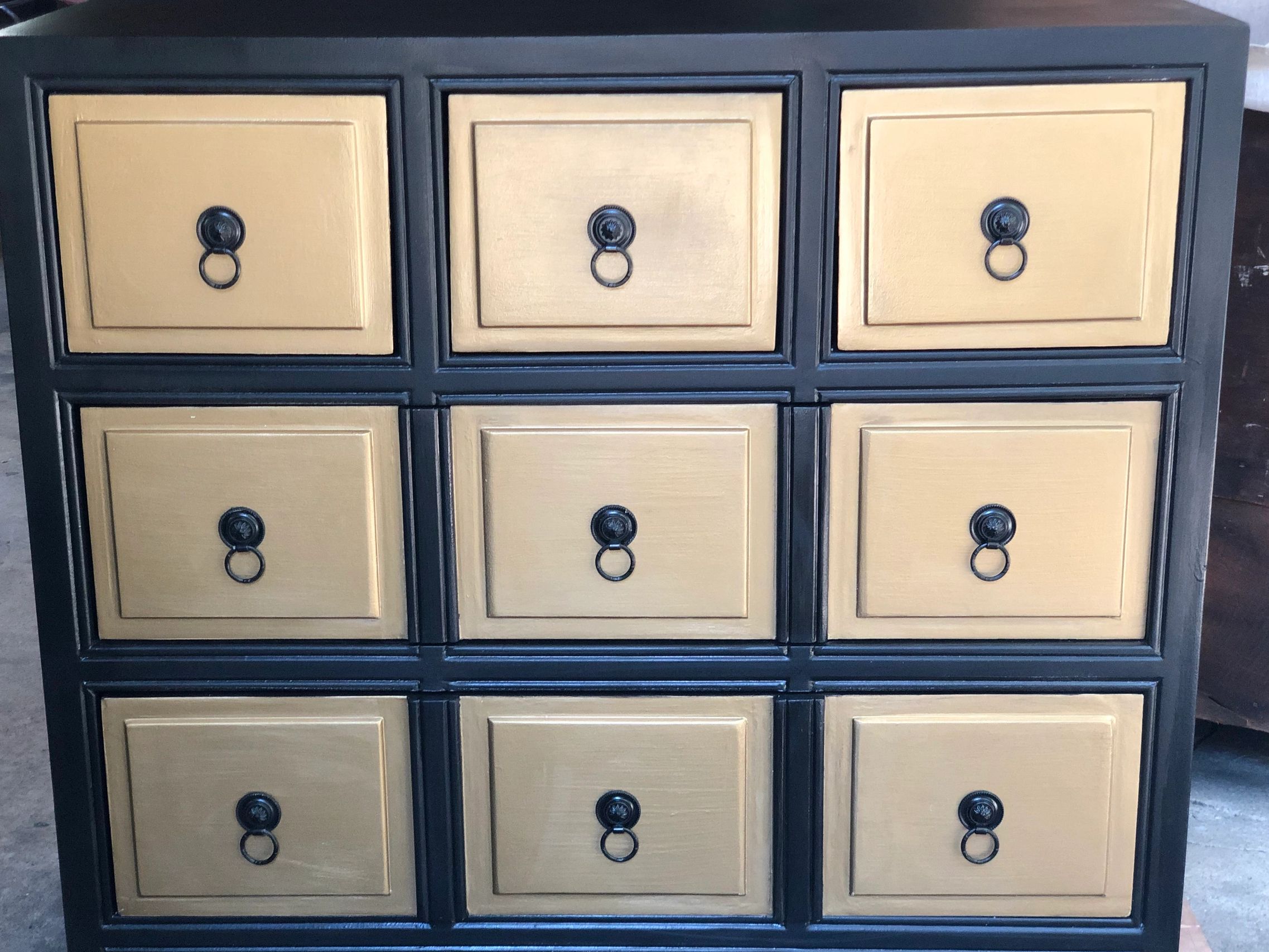 Refreshed and renewed, this custom piece had a makeover that went from multicolor drawers to a uniform, solid gold theme that my client requested. Love the upgrade!