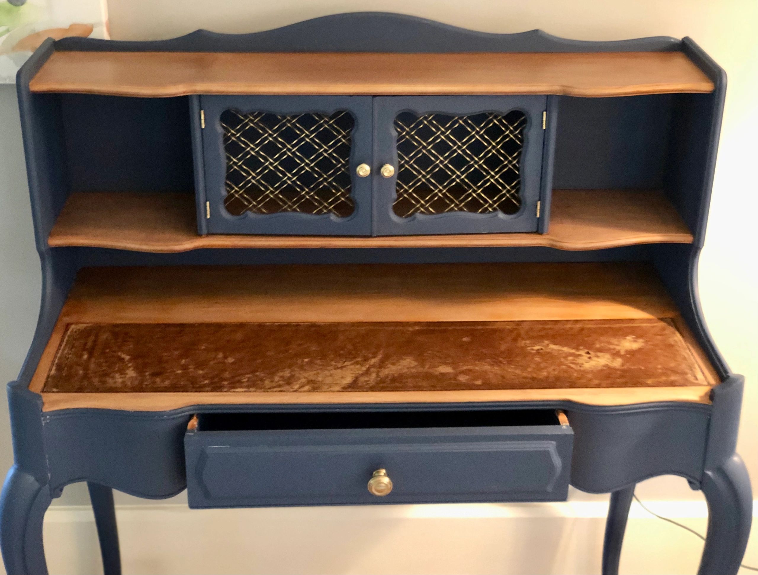 This vintage desk was beautifully updated while still keeping it's charm and history. With it's weathered leatherette inlay and claw feet, this stately and personally customized piece is a stunning throwback with a twist.