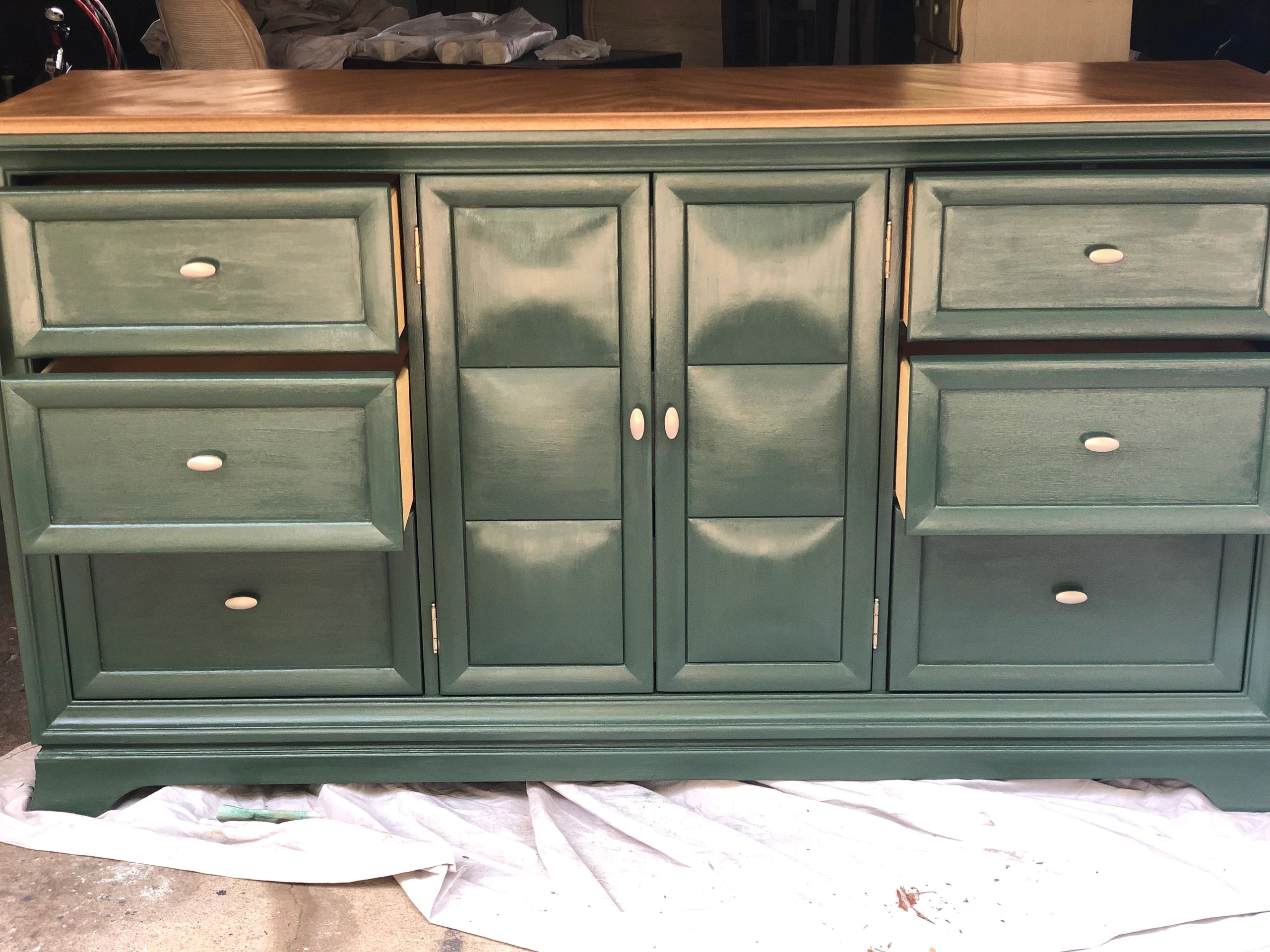 A customized piece, my client asked for this luxurious Hickory Hill green, with a driftwood stain on top. But the surprise comes when you open the center doors to find three more drawers painted in a contrasting off white to help wake up tired eyes in the morning.