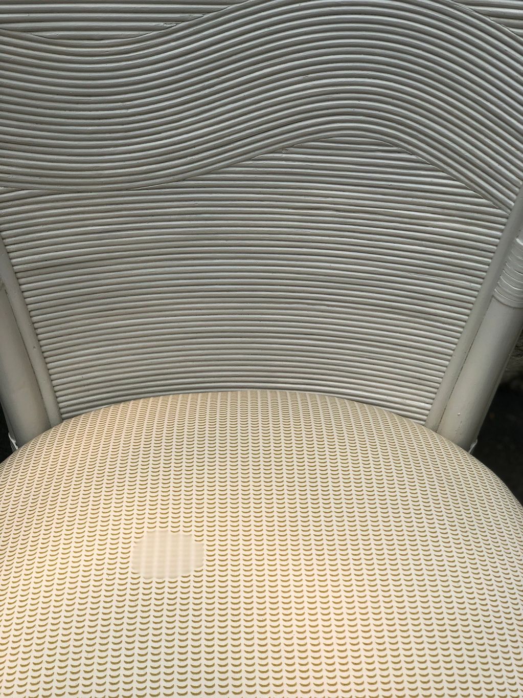 The repainted & reupholstered wicker chair added softness to a sunny workspace with a vibrant blue desk. The chair's back has a smooth wave in its center which inspired the new fabric with its golden half-moon wave of its own. It's almost fitting that the water droplet on my lens shows up in this shot on the seat. The identical chair is available for reupholstering and painting. A comfortable