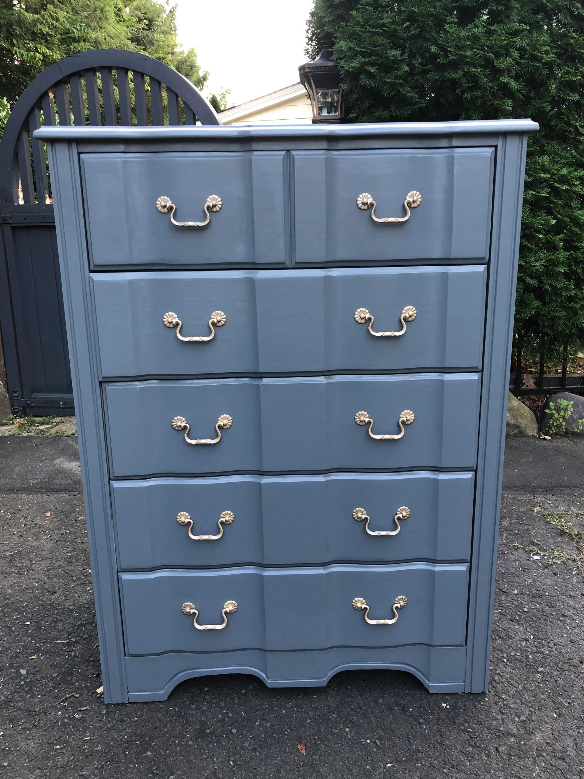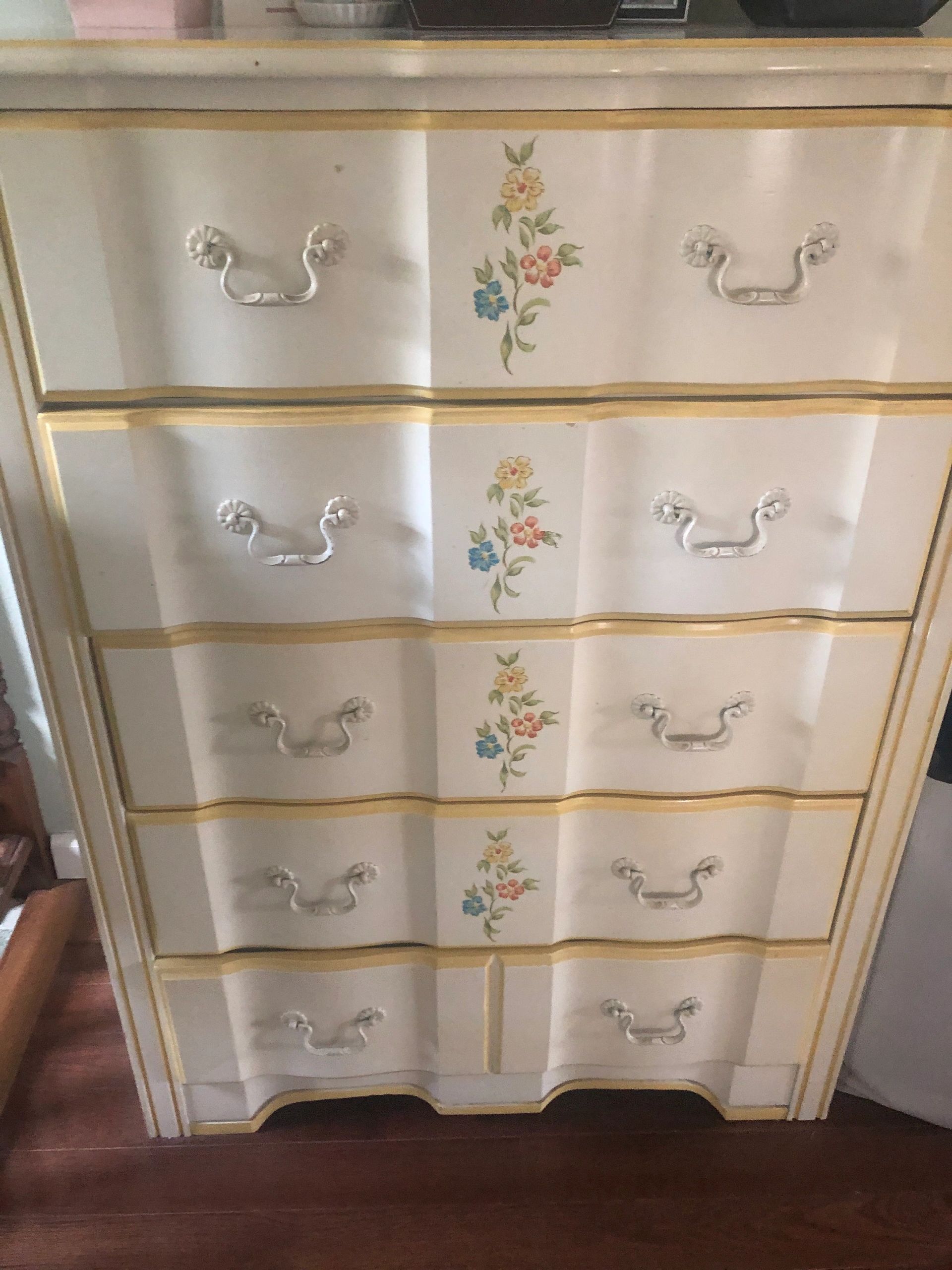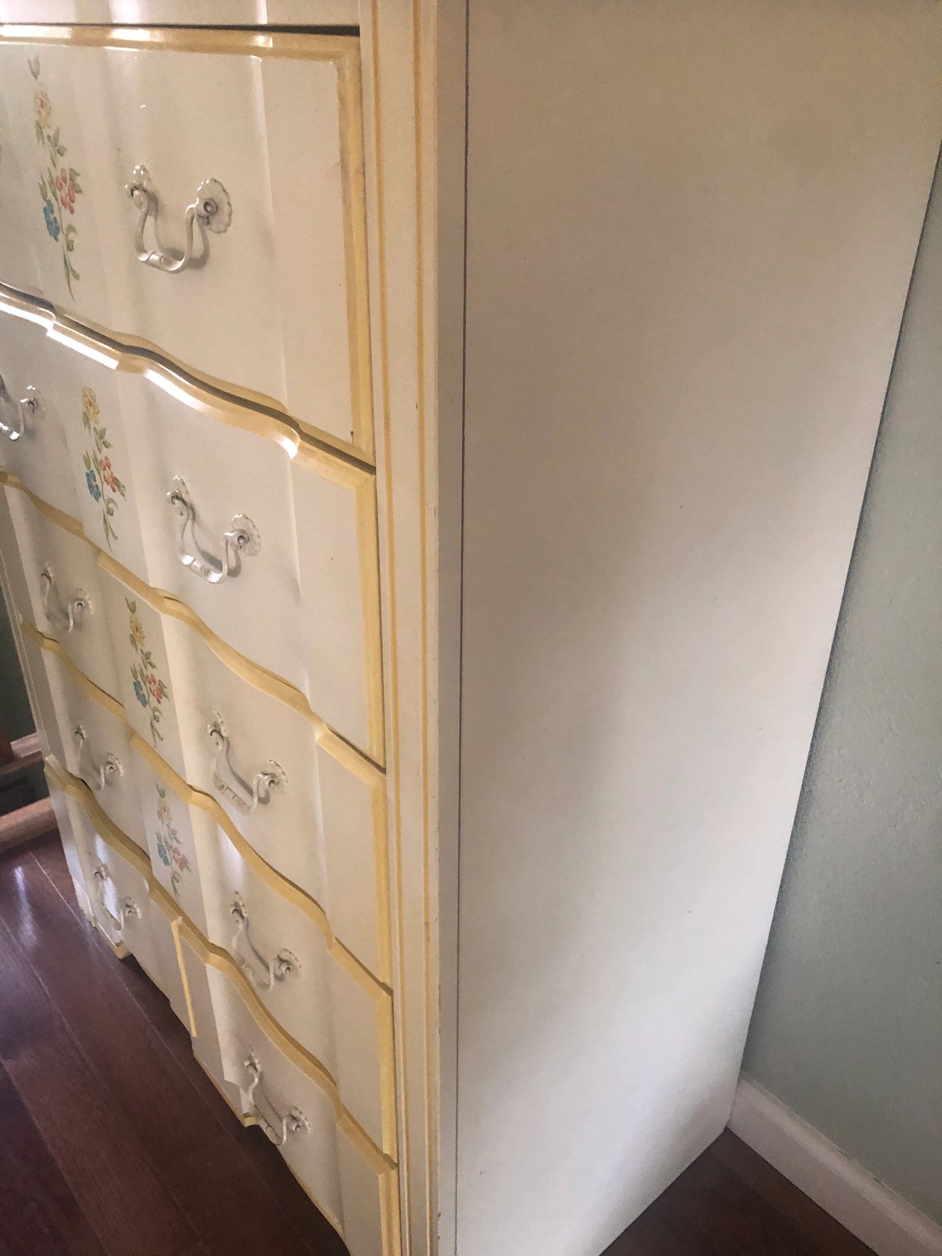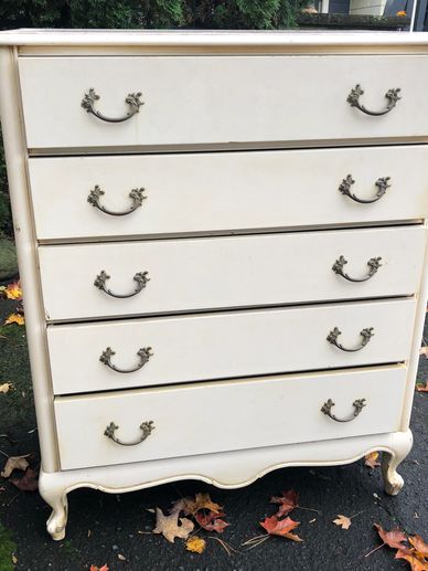 This french provincial style dresser with it's solid, rectangular drawers can work in any bedroom in your house. It has just enough curve at the bottom to give it the look we love, but feels neutral enough to paint it whatever your favorite color is. Easy to change out the hardware to make it more masculine or simply clean and paint them to make any girl's bedroom more special. Reach out and let's make this piece work for you!