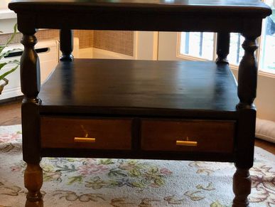 A perfect 24” square that offers ample table top space for snacks & drinks, a bottom shelf for your favorite books or magazines and a drawer to keep your playing cards or remote controls out of site. This table does not disappoint. Keeping the rustic wood texture, it’s painted in a warm black with legs and drawer-face stained in a dark brown. The gold T-pulls add something bright to this modern farmhouse piece and it styles well in most spaces including a man cave or family room.