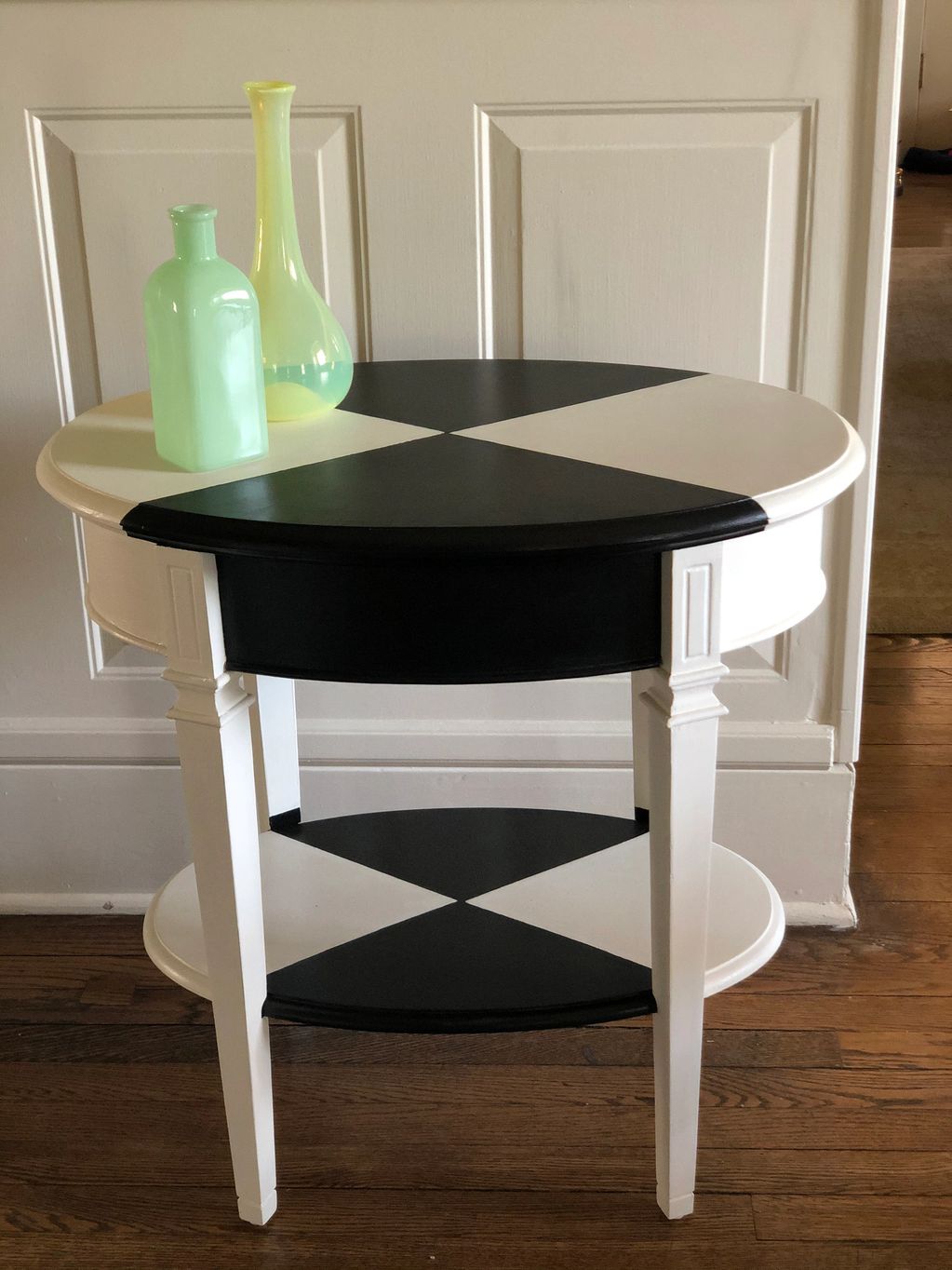 This end table was sanded and repainted in the direction that the wood grain was moving. Definitely a conversation piece in a room where it happens.