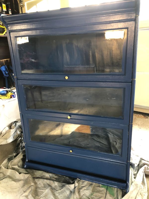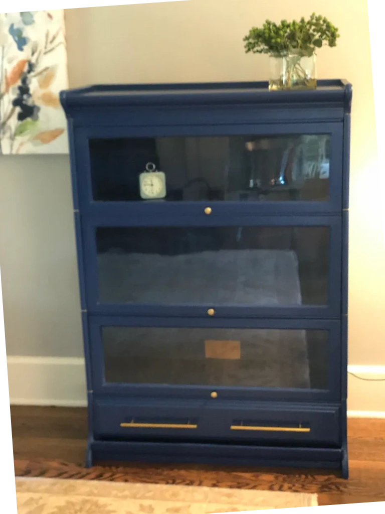 Grand, bold and beloved, this Gunn Barrister Bookcase has been sanded and repainted in an Inky Blue with gold buttons on the framed, glass doors and sleek gold handles on the drawer at the bottom. This bookcase can surely hold your books, but it can also showcase your special items as one or all the glass doors can be removed in a snap. This is a statement piece you'll love for a lifetime. The Gunn Furniture stamp has been maintained on the bottom shelf. $450 SOLD